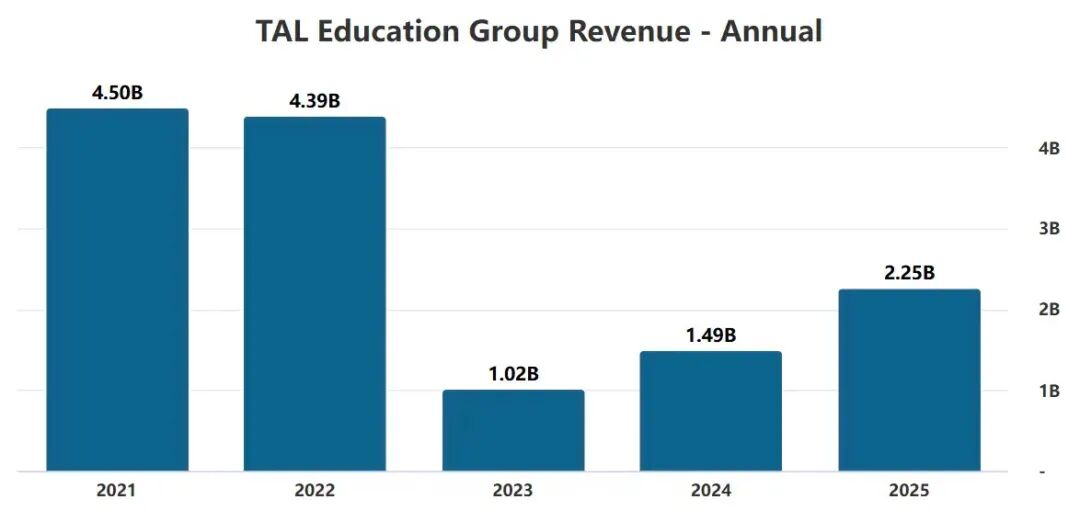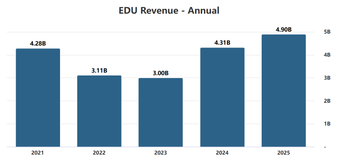 财务数据印证了这一转型的效果。FY2022 受业务关停和减值影响,公司营收跌至 31.05 亿美元,净亏损高达 11.64 亿美元;但随着业务结构调整逐步见效,FY2023 营收虽小幅回落至 29.98 亿美元,亏损却显著收窄至 1.32 亿美元。此后两年,公司收入快速恢复,FY2024 升至 43.14 亿美元,FY2025 进一步达到 49.00 亿美元,基本回到「双减」前水平。盈利端则实现由负转正,FY2025 净利润 0.84 亿美元,毛利也由 FY2022 的 13.51 亿美元增长至 27.17 亿美元。这不仅得益于营收规模的恢复,更在于业务模式转型——由依赖课时消耗转向以素质课程、留学语培、研学营地和数字化内容为主的「轻课时、重内容」模式。这种模式边际成本低、毛利率高,使得公司即便在整体费用压力下,盈利质量仍得到改善。费用端虽然销售与管理开支仍高企(FY2025 分别为 7.84 亿美元与 14.44 亿美元),但相较收入增长,费用率已出现下降趋势。