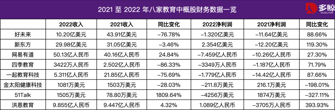 2021 至 2022 年,是好未来、新东方、网易有道、洪恩教育、51Talk、一起教育科技、四季教育 和 金太阳健康科技 八家教育中概股集体经历剧烈震荡的阶段。这一年间,它们的财务数据呈现出明显的「整体承压、分化初显」格局,成为此后行业重构的起点。