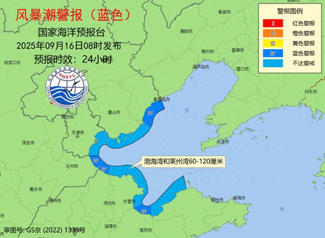 受冷空气的影响,预计9月16日中午至17日上午,渤海湾和莱州湾将出现60到120厘米的风暴增水。河北省秦皇岛市、沧州市、山东省滨州市和潍坊市的风暴潮预警级别为蓝色。17日上午视情况解除风暴潮警报。