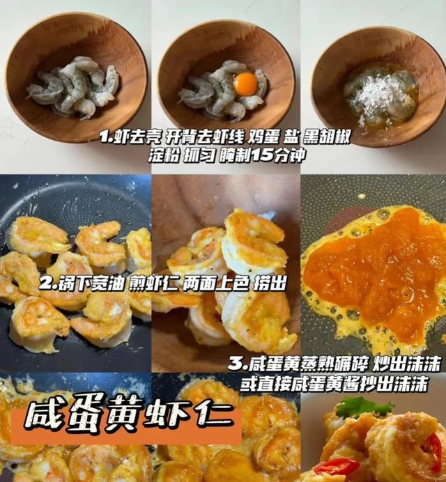 最后,我们来介绍一道特别的咸蛋黄虾仁。咸蛋黄的沙糯口感与虾仁的鲜美相得益彰。首先将咸蛋黄蒸熟后压碎,虾仁用料酒和少许盐腌制。