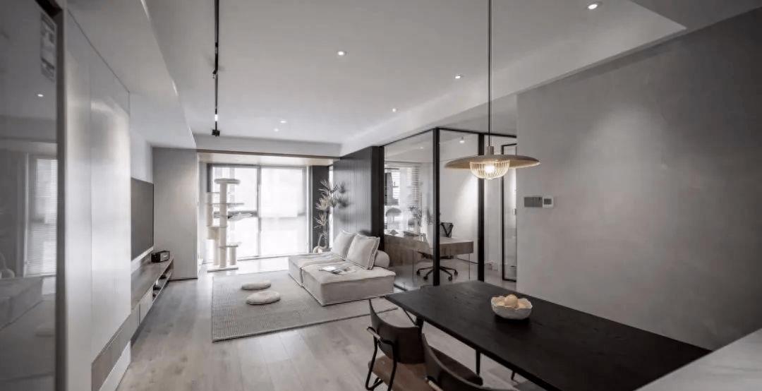 沙发墙改用落地玻璃,通顶设计一拉到顶,效果简洁明亮又大气,看上去也很时尚,玻璃后面是书房,这样一改,使得客厅在纵向空间得到延展,等于同时优化了客厅和走廊。