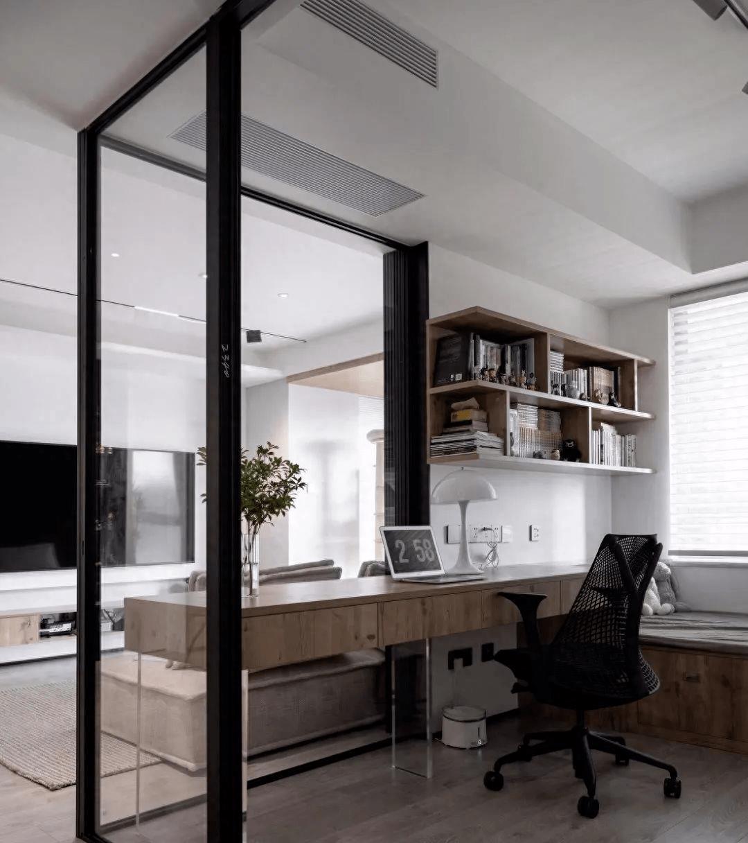 书房就是沙发墙后面的空间,这里改造成落地玻璃墙,房间也更加明亮了,这里的书房是一个半私密空间,它的作用主要是解决客厅的问题。