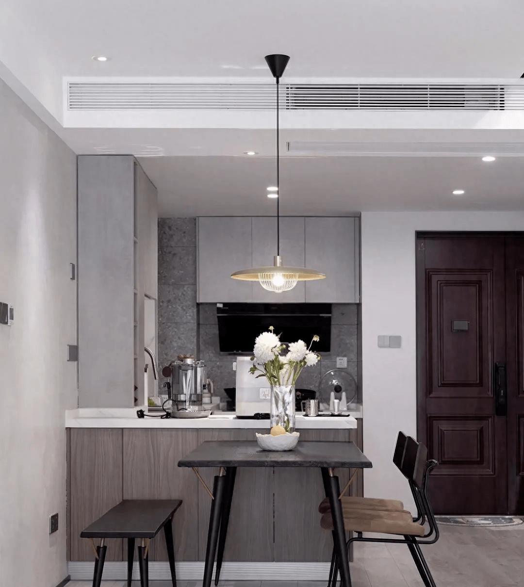 餐厅和厨房位于玄关左侧,开放式的设计让玄关也更宽敞,进门的时候更显大气,吊顶布置了中央空调出风口,一是能缓解厨房在炒菜时的闷热,二是能让餐厅更凉爽。