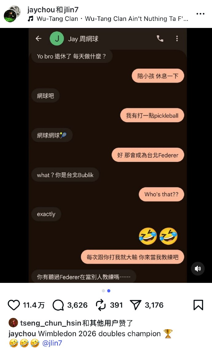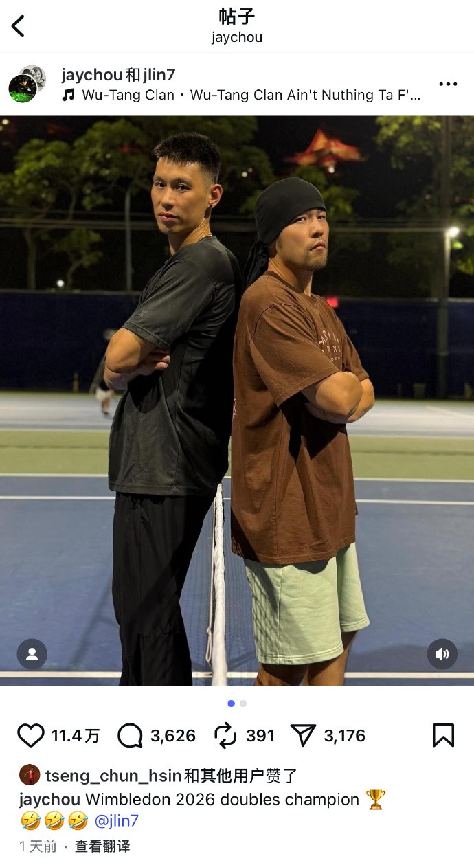 9月15日,周杰伦、林书豪在社交平台内容更新,晒出两人背靠背站在网球场合影和聊天截图,并配文:Wimbledon 2026 doubles champion(温布尔登 2026双打冠军)。