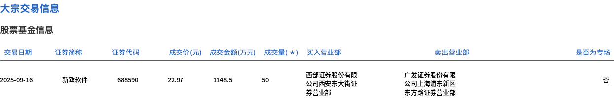 9月16日,新致软件大宗交易成交50万股,成交额1148.5万元,占当日总成交额的4.1%,成交价22.97元,较市场收盘价23.32元折价1.5%。