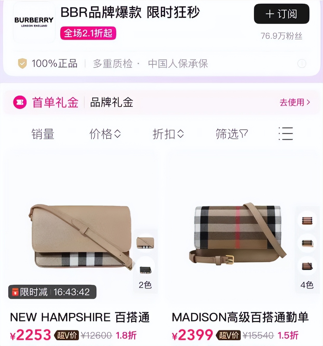 唯品会依托全球上千人的买手团队和深耕多年的供应链,打造了“品牌+折扣”的特卖模式。迄今为止,平台合作品牌数超过46000家,甚至不少奢侈品牌也包括在内。像在之前平台举办的“限时狂秒”活动中,COACH和Burberry的爆款包包直接被打到了2折以内,以至于刚上架不久就直接售罄。