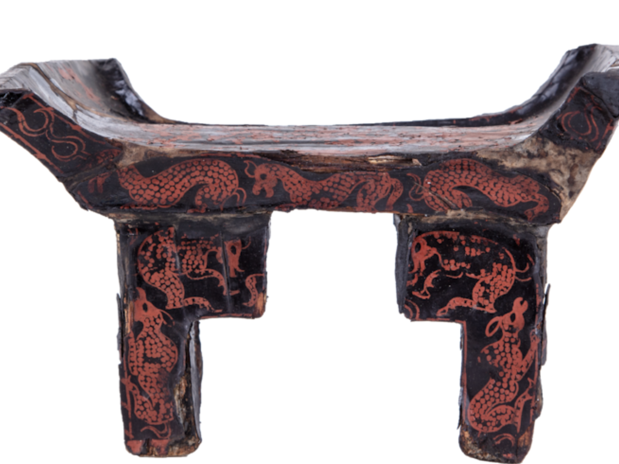 俎面呈长方形并髹红漆,四边起棱且两端上翘。表面用红漆绘制瑞兽珍禽,展现出楚地艺术中特有的神秘与飞扬。纹饰间隐约可见细密的几何勾连,既象征着天地沟通的巫祭传统,亦暗含春秋时代礼制与信仰的交融。