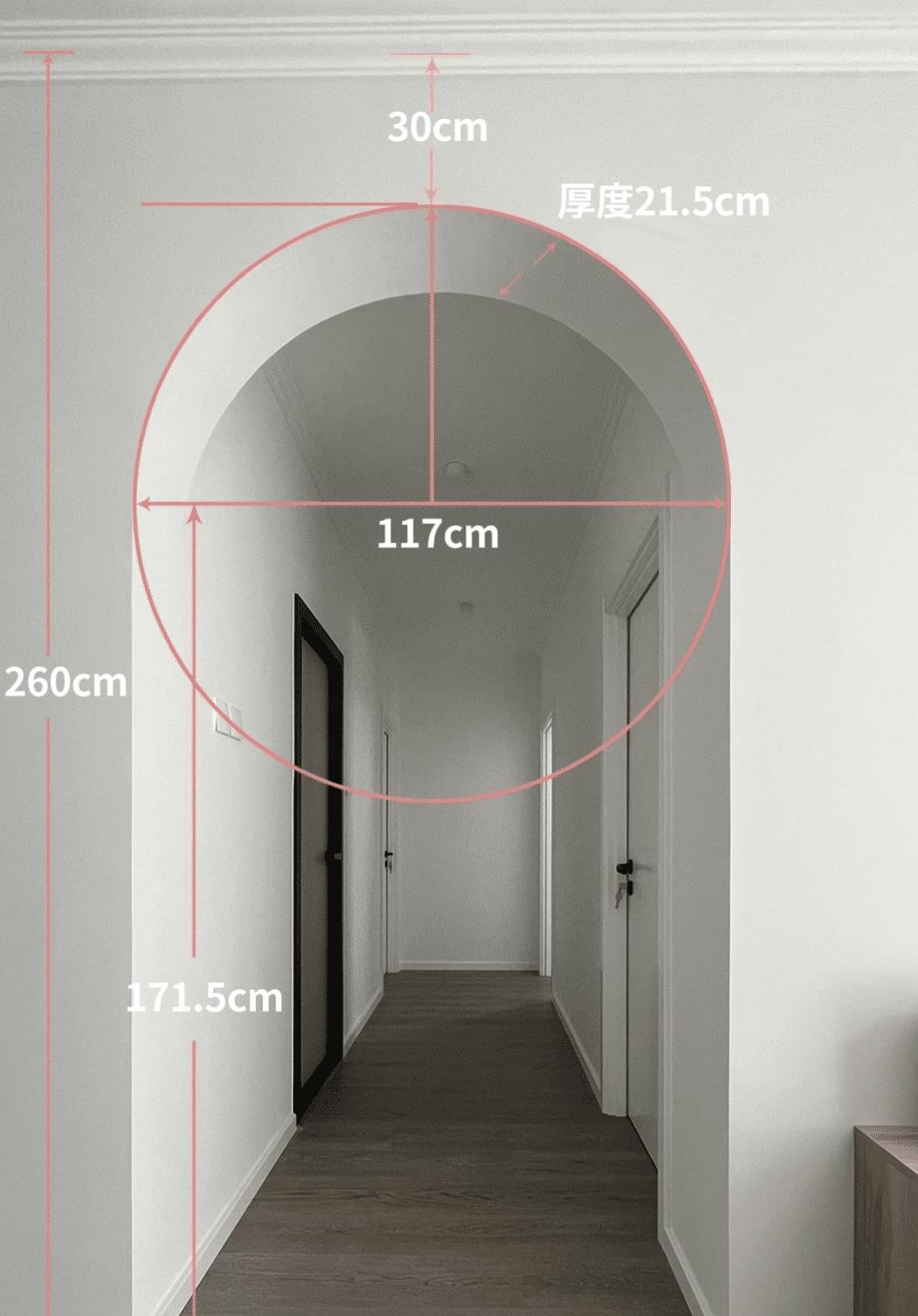 拱形门有圆拱、平拱和半拱选择,不同拱形制作工艺不同。常规尺寸门洞建议做圆拱门或半拱门,需要先确定空间位置,然后确定门的高度和厚度,最后再用石膏板切割出对应的弧形,圆弧半径=门洞宽度÷2,顶部距离天花板要留白20-30cm。