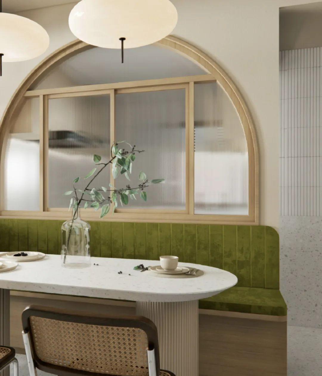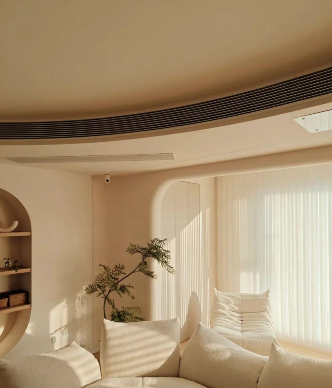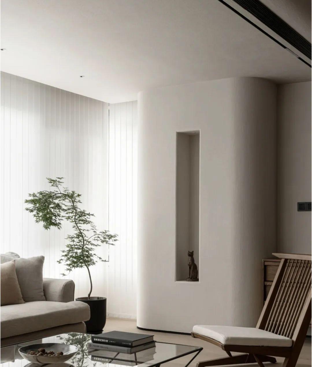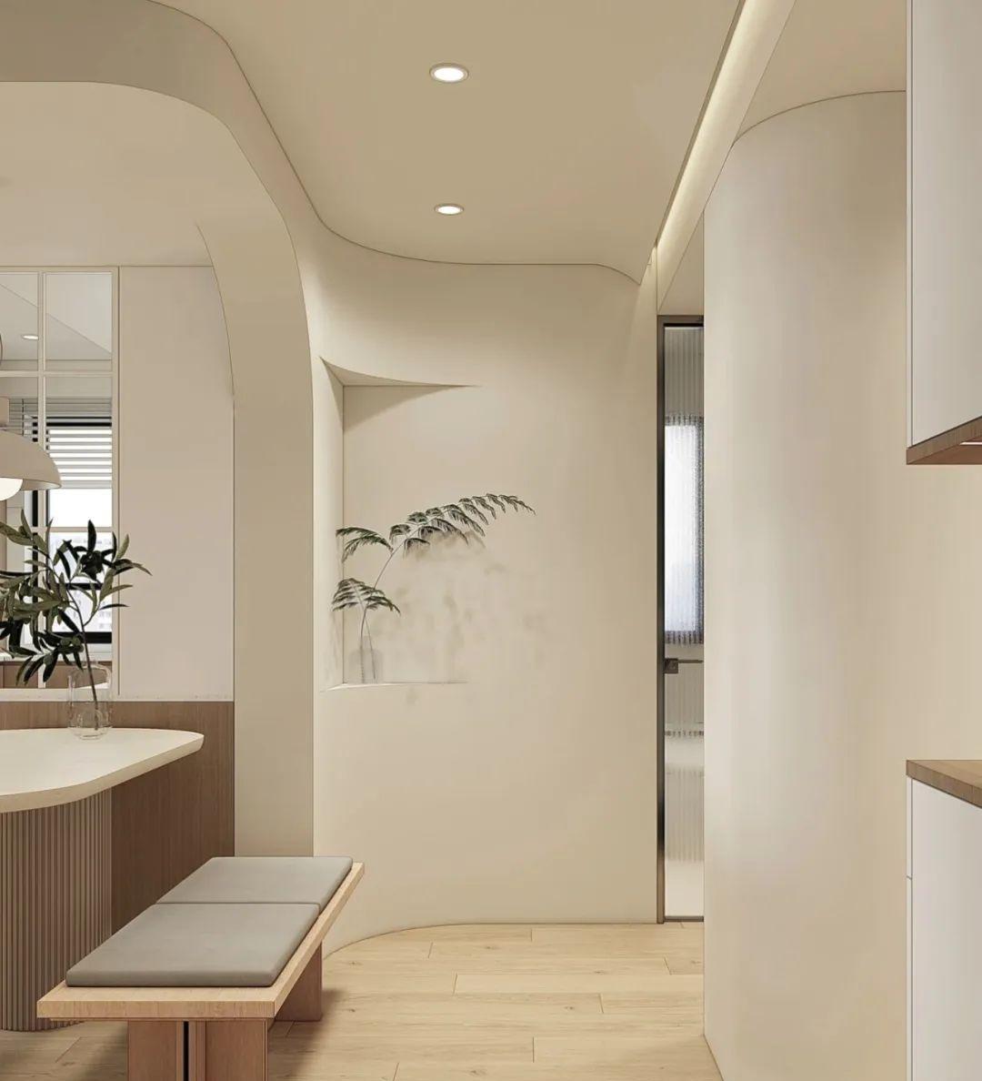圆角设计是以弧形和倒圆角为形态,游走于极简风、侘寂风、奶油风等装修风格,改变户型内的结构缺陷,弱化结构中的尖锐棱角,让空间在视觉上看起来更有造型和延伸性。