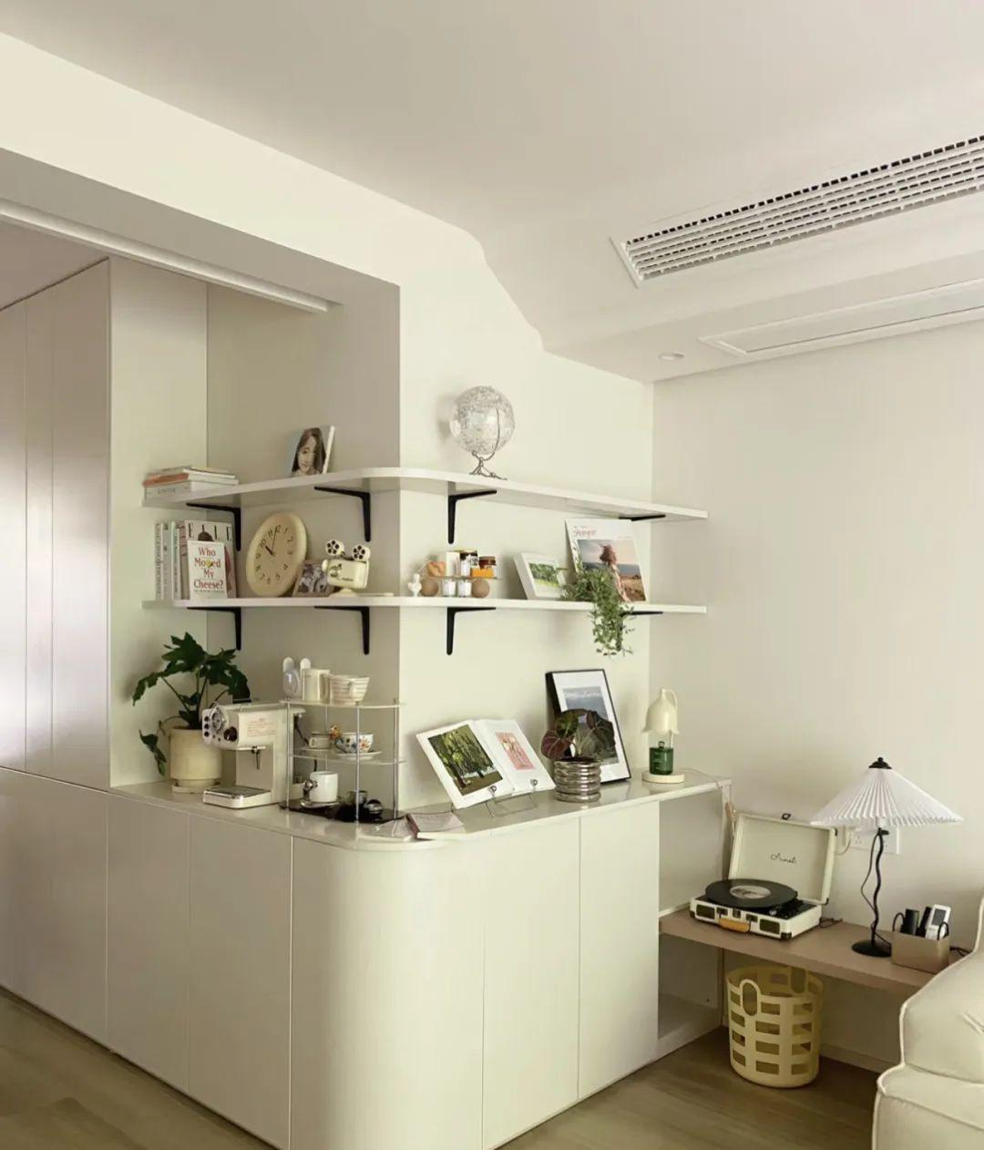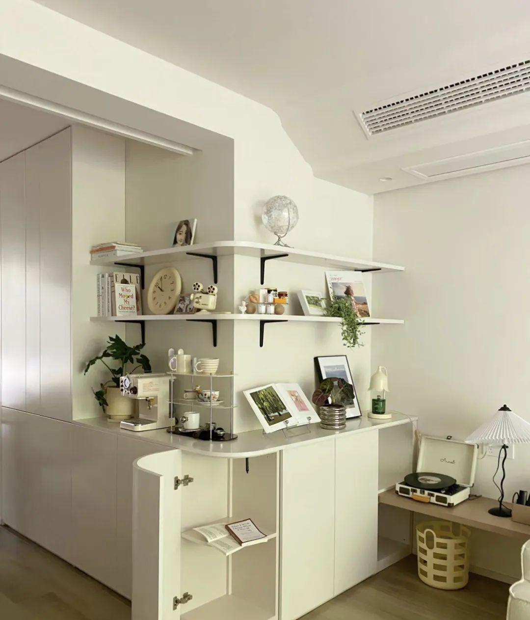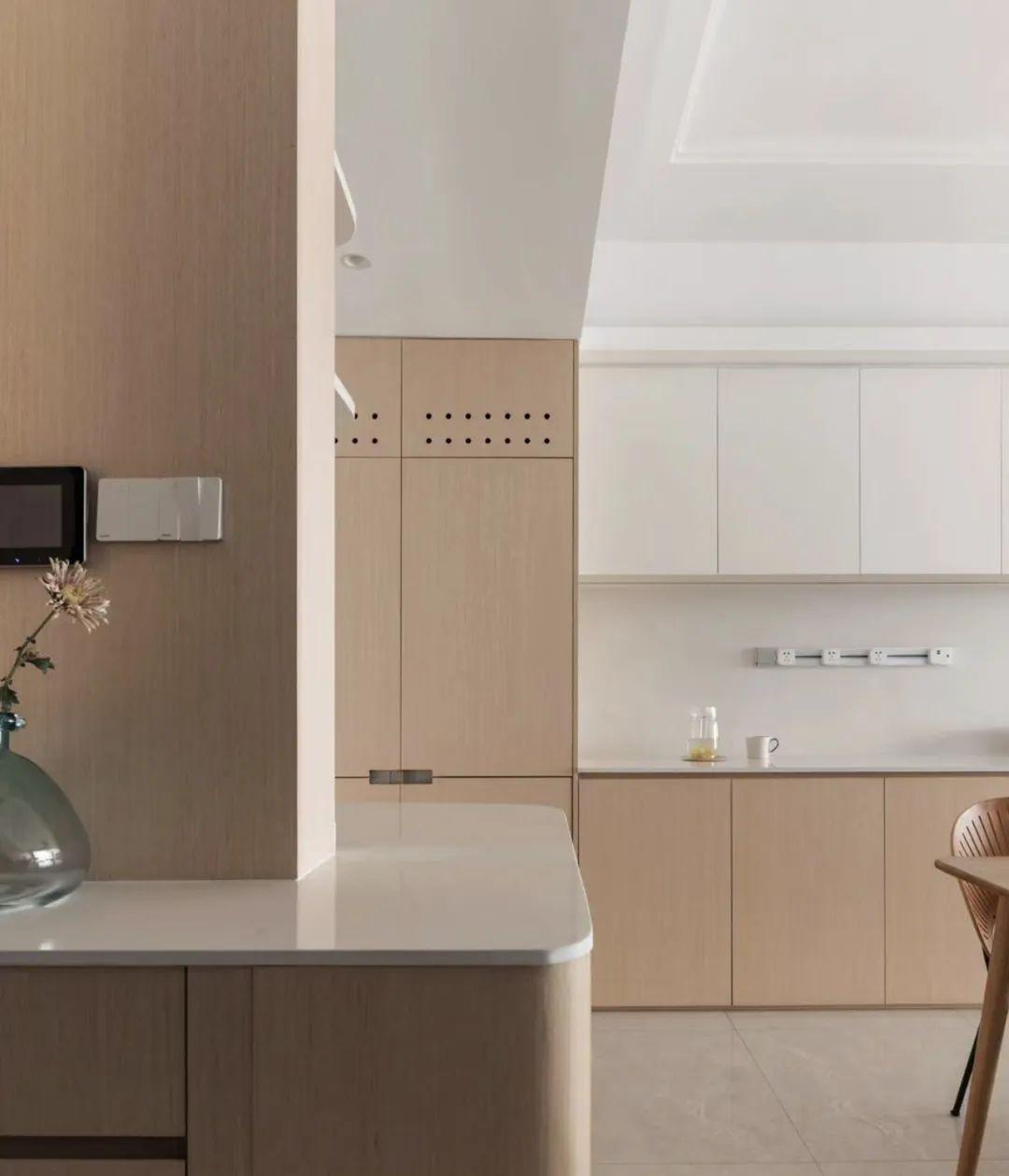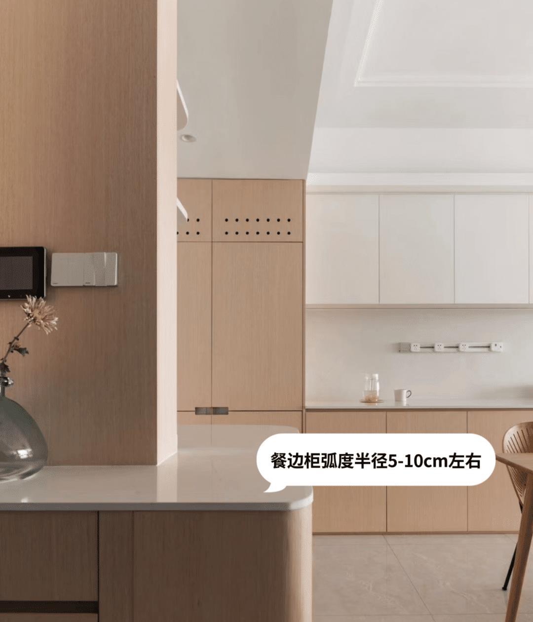 特别对于有老人孩子的家庭,直角柜体难免会产生不必要的创伤,转角处更建议做圆角处理。弱化了视觉上和物理上的棱角,安全、温柔又治愈。