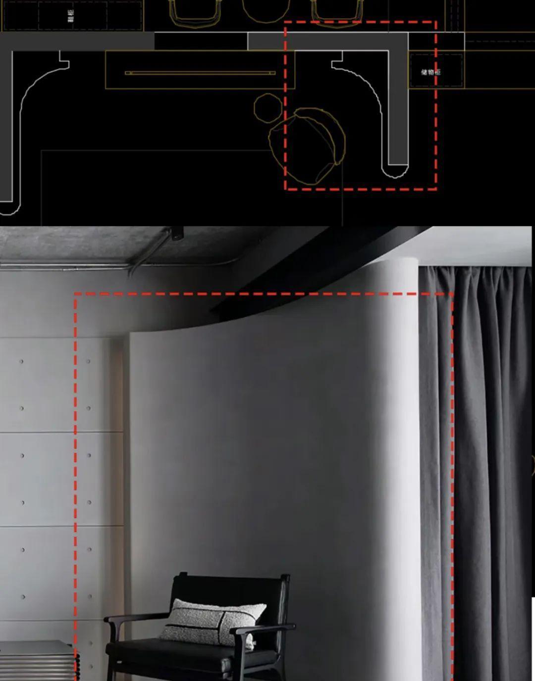 这时候,就可以利用弧形或者是小圆角来弱化柱体的凸出而又尖锐的阳角部分,让其看起来有流动延伸的效果,美化空间,扩大空间活动区域。
