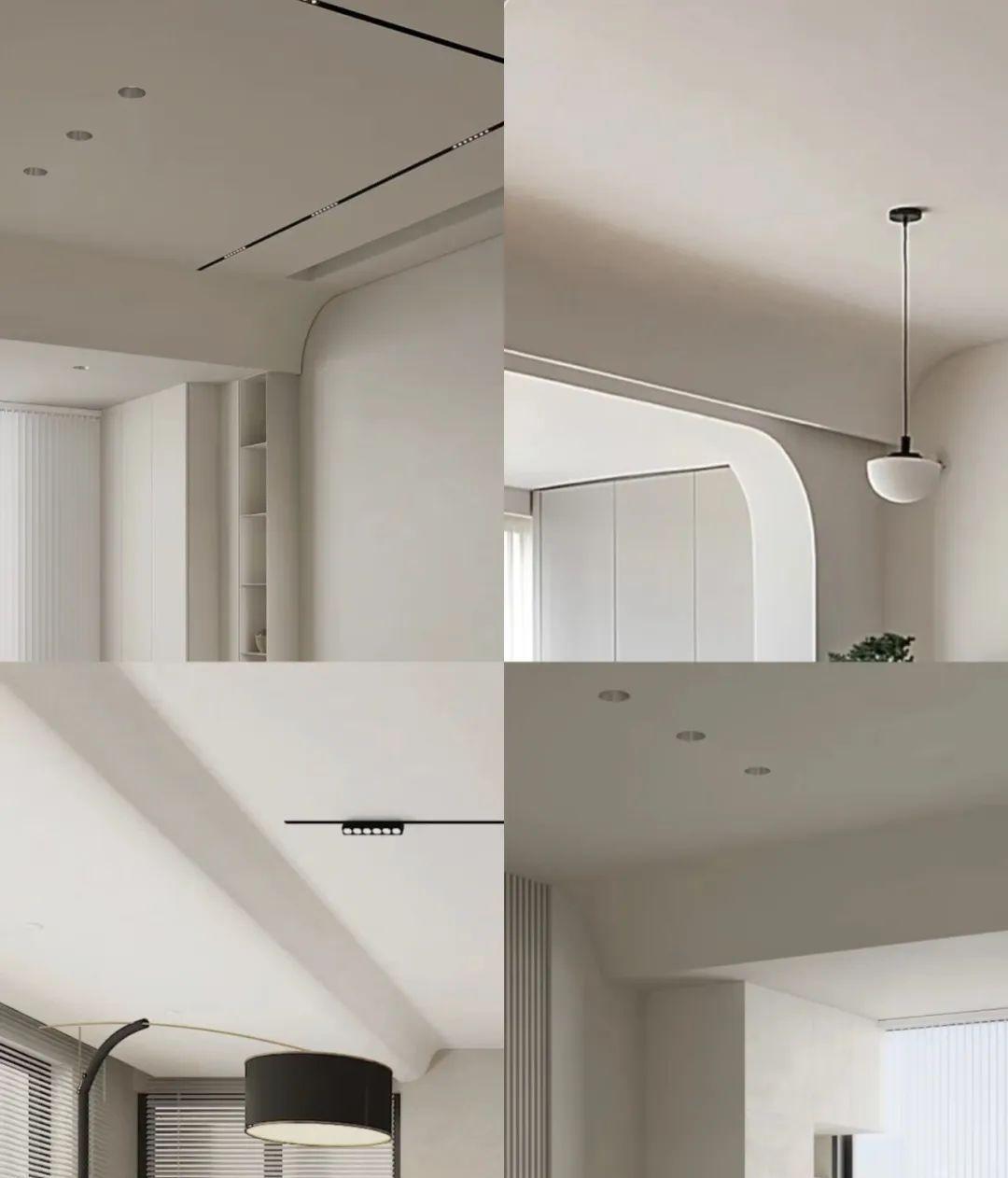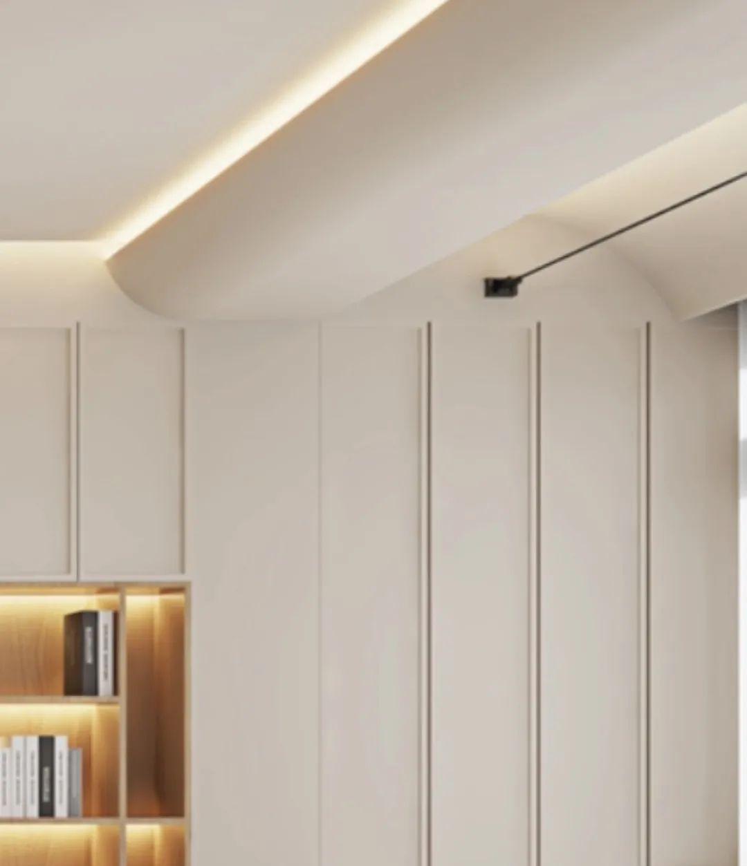 不少户型在两个空间的连接处都会存在承重梁,为了不影响层高,多数不会用吊顶拉平,可尖锐的棱边看起来又很生硬,想要在不牺牲层高的前提下将顶面美化处理,就可以采用弧形圆角设计。