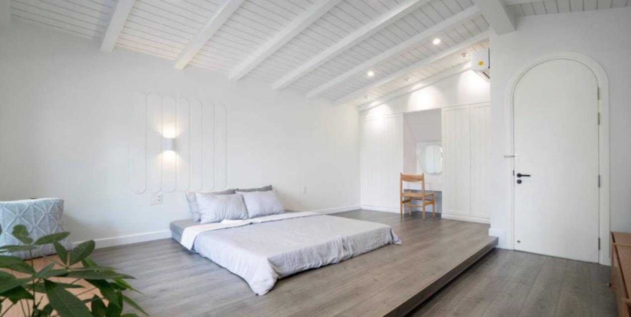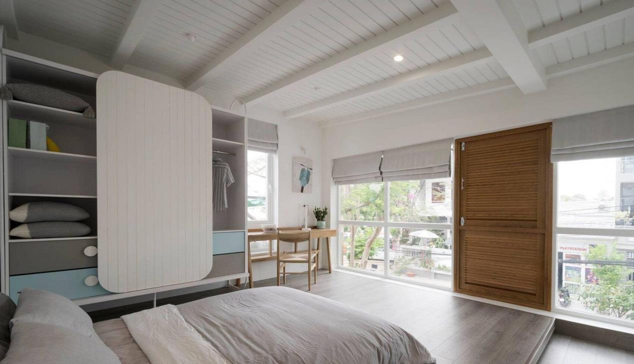 卧室里打造地台床,睡觉起来更加安心舒适,平时可以直接坐在地台上休息。每个窗户都安装了罗马帘,节省空间不占地,方便控制给人一种休息空间的慵懒随意。