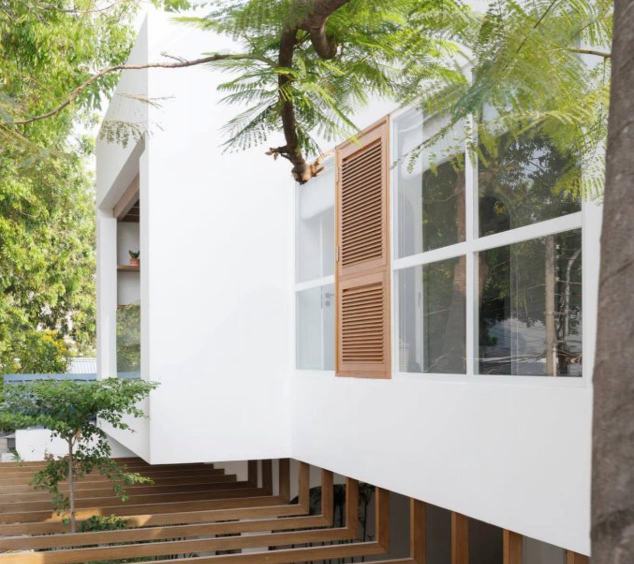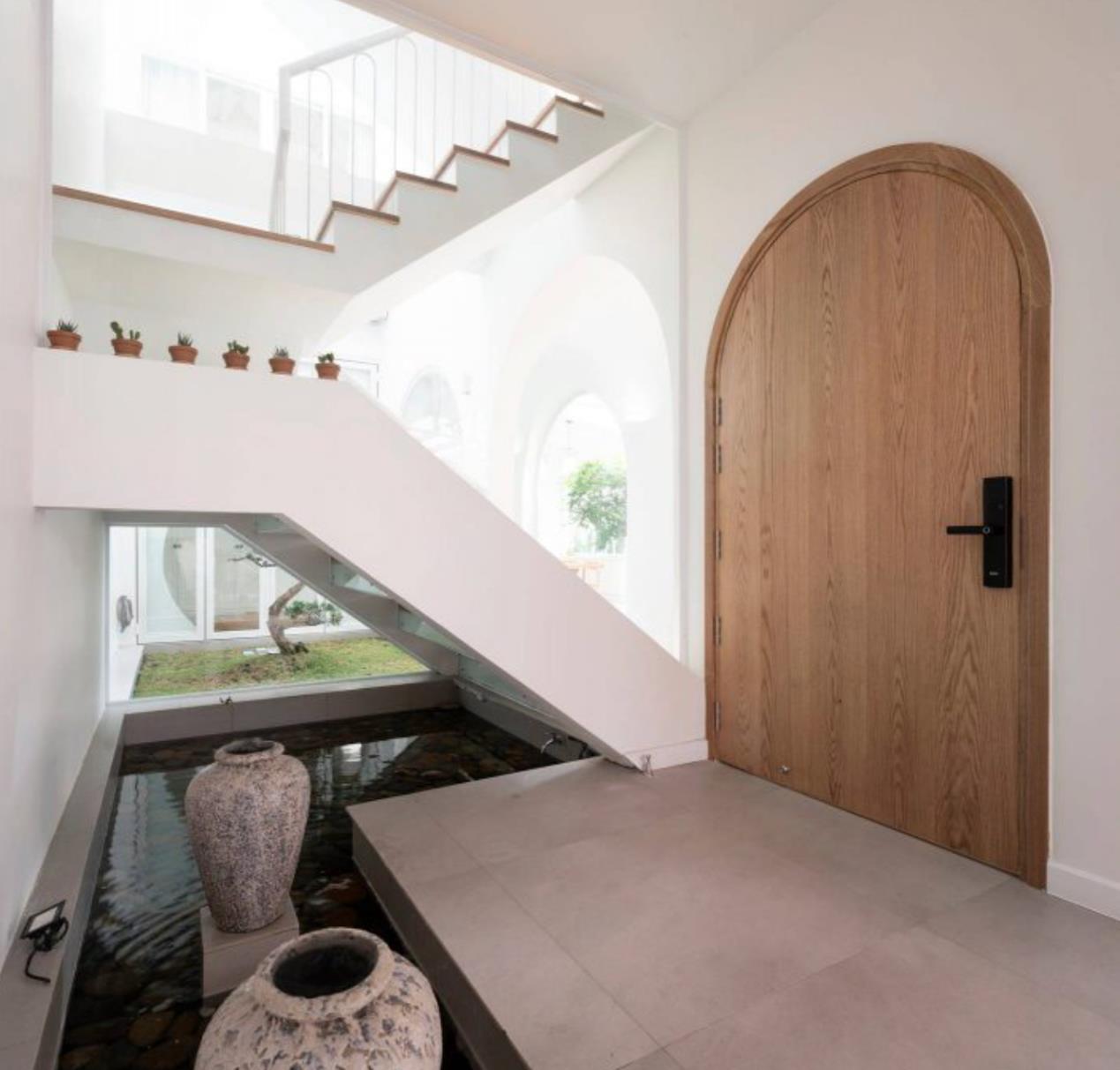 别墅内部用天井改善采光,木质的楼梯搭配白色的扶手,简单却很清爽。