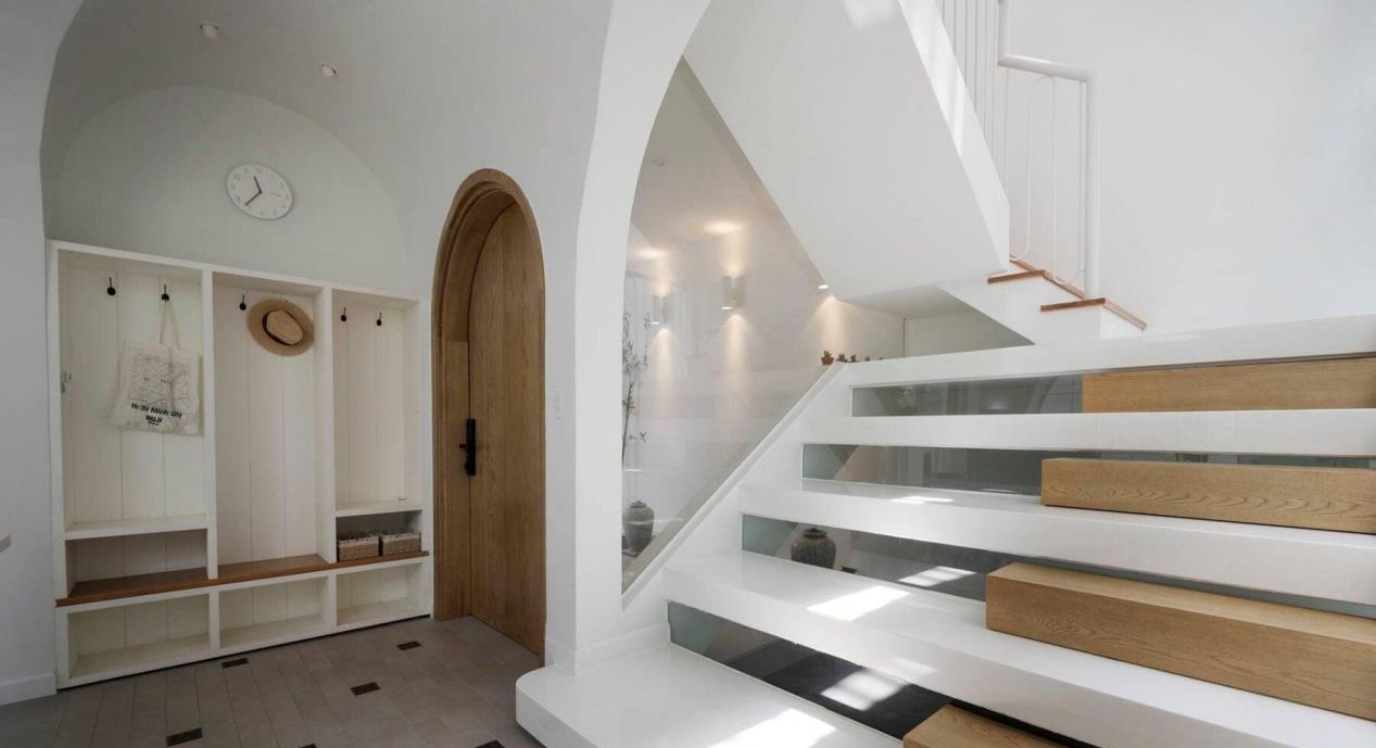 玄关位置靠墙打储物柜,挂衣区和换鞋等功能组合在一起,可以直接通过楼梯上楼,也可以去一楼的客厅等空间。