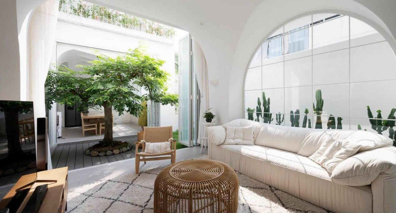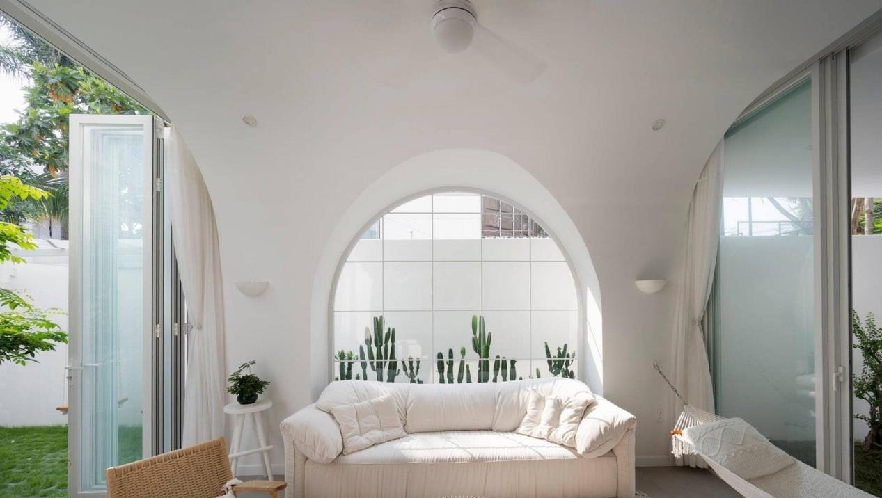 客厅可以直接通往院子,一面墙的玻璃窗搭配一面拱形门,在客厅里就可以欣赏到整个院子,像阳光房一样,光线很不错。平时一家人,还有客人来访时就坐在这里娱乐、聊天,如同身临庭院一般,惬意自在。