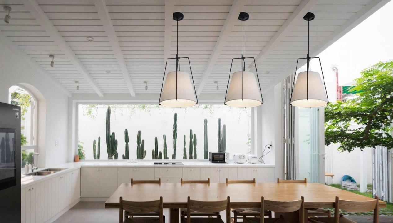 穿过一侧的小花坛,可以走向厨房餐厅的位置,两个空间整合一体设计,方便家人就餐。超长的L型的操作台,几个人一起下厨也不觉得拥挤。有了独立的就餐空间,安静不被打扰,一家人可以其乐融融地坐在一起,聊天、享受生活。