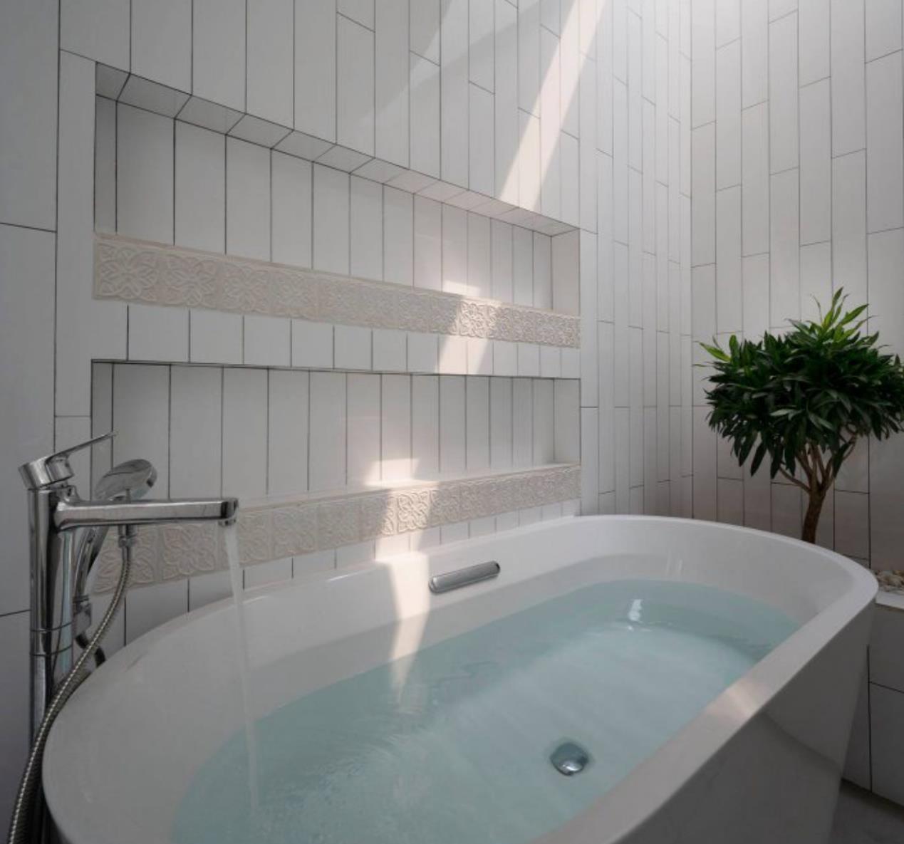 卫生间空间足够宽敞,摆放一张浴缸不是问题,在一侧的墙面另外打造两排壁龛置物,放一些随手可取的衣物用品刚好合适。