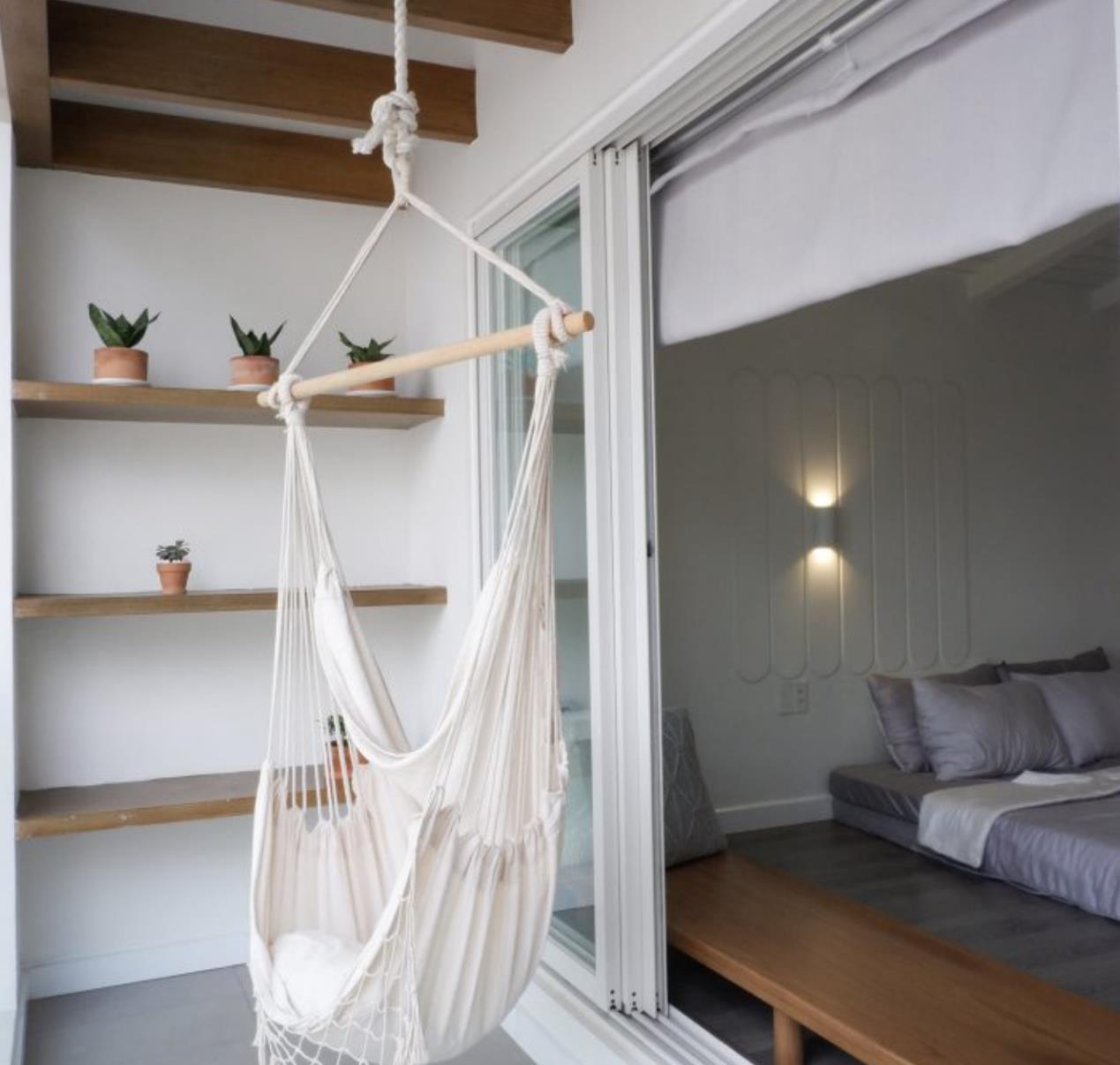 卧室的阳台安装了吊椅,闲暇时可以躺在这里看书、休息,墙面几层的隔板,就是为了给屋主人养花摆放盆栽使用,让生活变得更有趣。