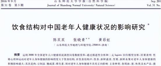 [1]陈双双.饮食结构对中国老年人健康状况的影响研究, 山东师范大学学报(自然科学版), 2016-09-15