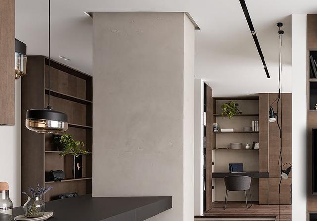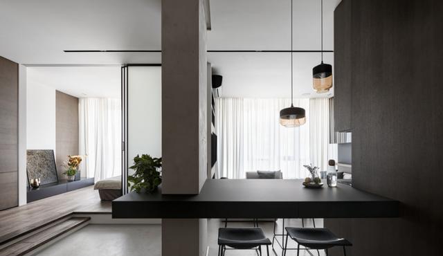 因为客厅空间不大,所以没有设计单独的餐厅区,而是连着橱柜延伸出一方简单的桌面,搭配高椅,一家人的四季三餐就在这里解决,从侧面看,灰色的隔断墙面和电视墙在同一水平面上,打造层次丰富的空间感。