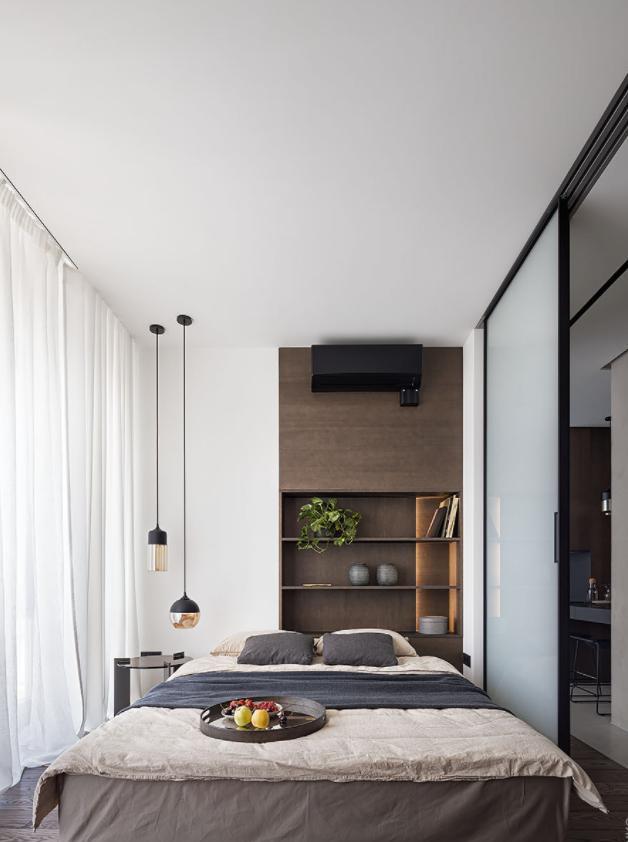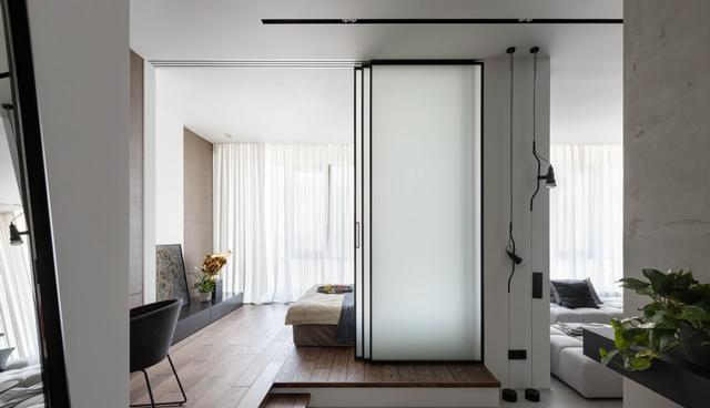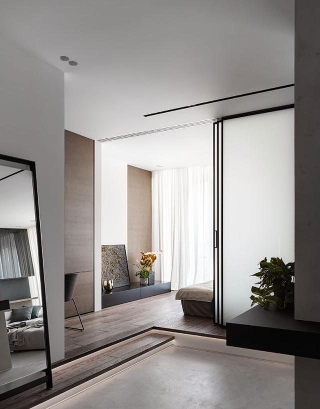 地面抬高几公分是隐私区和公共区域的简单区分,卧室用黑色边框勾勒出的朦胧玻璃门,为私密区域带来了更多的保护,清透的玻璃质感又让卧室采光很好。