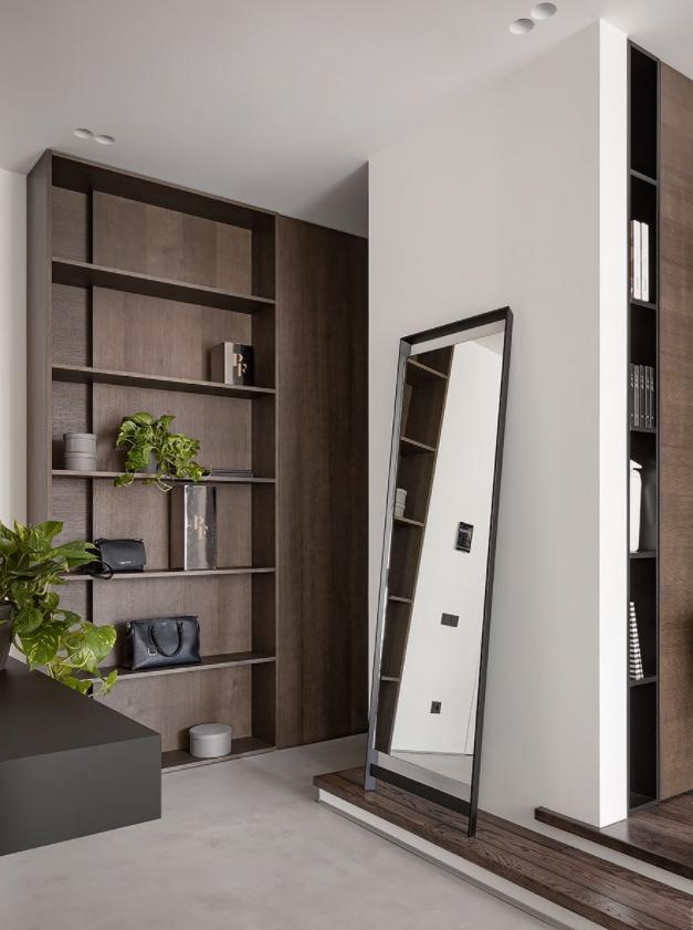 开放式展示区用来存放包包、各种化妆品很合适,和内嵌在侧面的书架形成相互呼应的关系,凸显出屋主对于生活品质的追求。