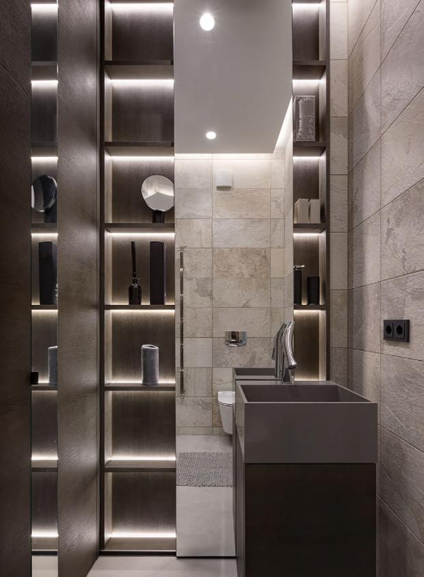 卫生间干湿分离,长方形的台盆柜不占地方,也增加了置物空间,墙面的开放式置物区内嵌灯带,用来存放各种洗漱用品、香氛等,屋主这样用心地对待家的每个小角落,把精致体现在生活的方方面面。
