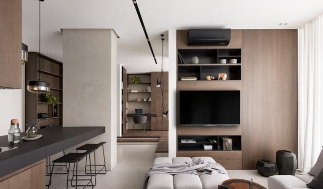 客厅面积不大,电视背景用棕色木饰面装饰,黑色置物区提供简单的收纳空间,有质感的客厅空间层次奠定安静的居家氛围。