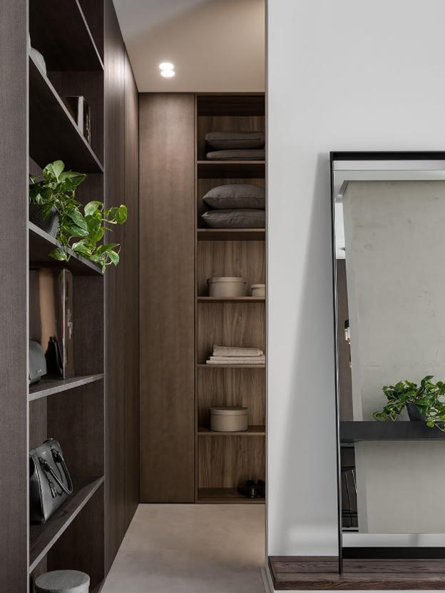 步入式衣帽间为入住者带来了“沉浸式”的更衣享受,整面木质柜体烘托出空间的安静与屋主沉稳的性格,开放式和封闭式收纳相结合,提高空间的利用率。