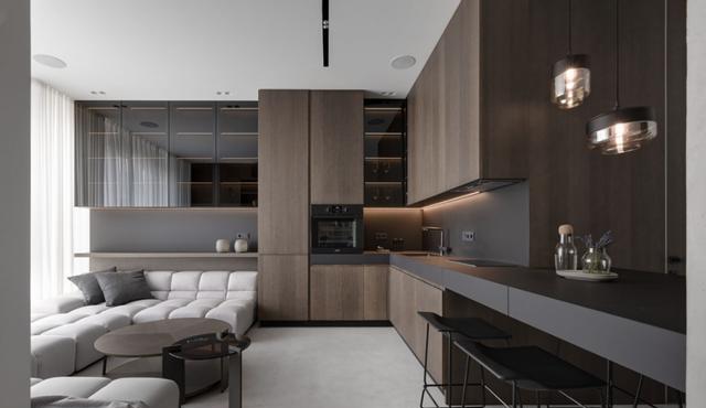 开放式厨房包围客厅,L型橱柜不会让空间显得压抑局促,统一的棕色原木色调和内嵌电器的整体柜让空间整体性很强,玻璃柜和橱柜连接,延伸至客厅沙发上方,用来收纳藏品很合适,置物架用来随手摆放物品很方便。