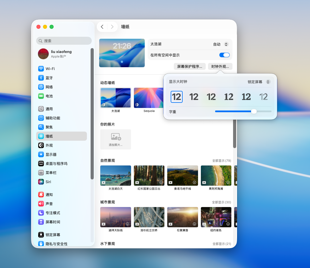 其次,我们现在可以自定义锁屏时钟样式。在「系统设置 - 墙纸」中点击「时钟外观」,即可设计相关设置,比如可以选择数字时钟的字体样式,并通过滑块调节字重,打造更个性化的显示效果。