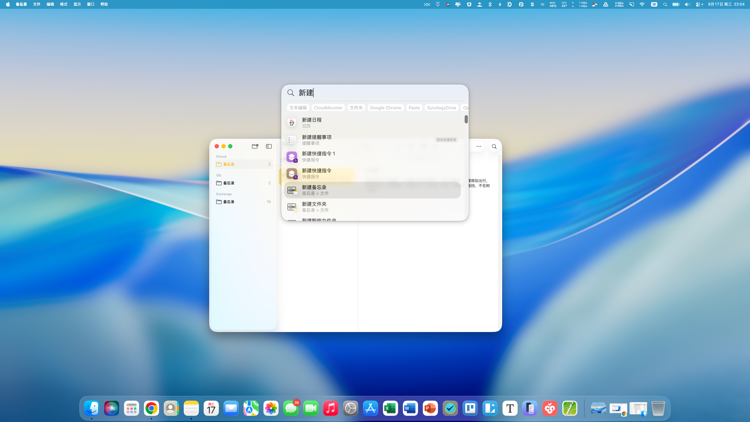 除了通过快捷指令完成任务外,全新的聚焦搜索还支持直接操作应用内的菜单项。例如,在打开备忘录后调出聚焦搜索,输入「新建」,系统会自动识别并显示菜单中的「新建备忘录」操作项,按下回车即可执行对应功能。
