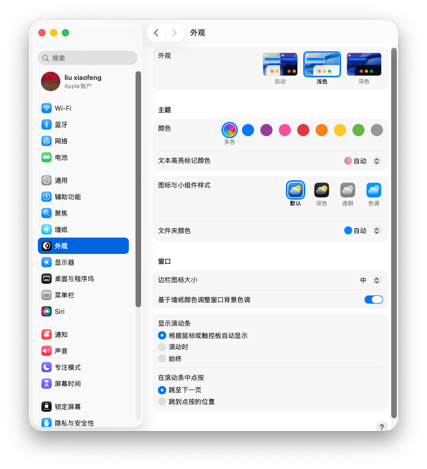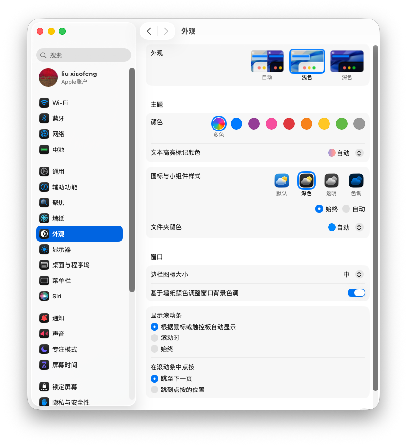 在「系统设置 - 外观」中,除了自动、浅色、深色模式外,我们还可以在下方的主题设置中调整整体配色,以及文本高亮标记的颜色,从而更清晰地区分按钮、弹出菜单和复选框等界面元素。