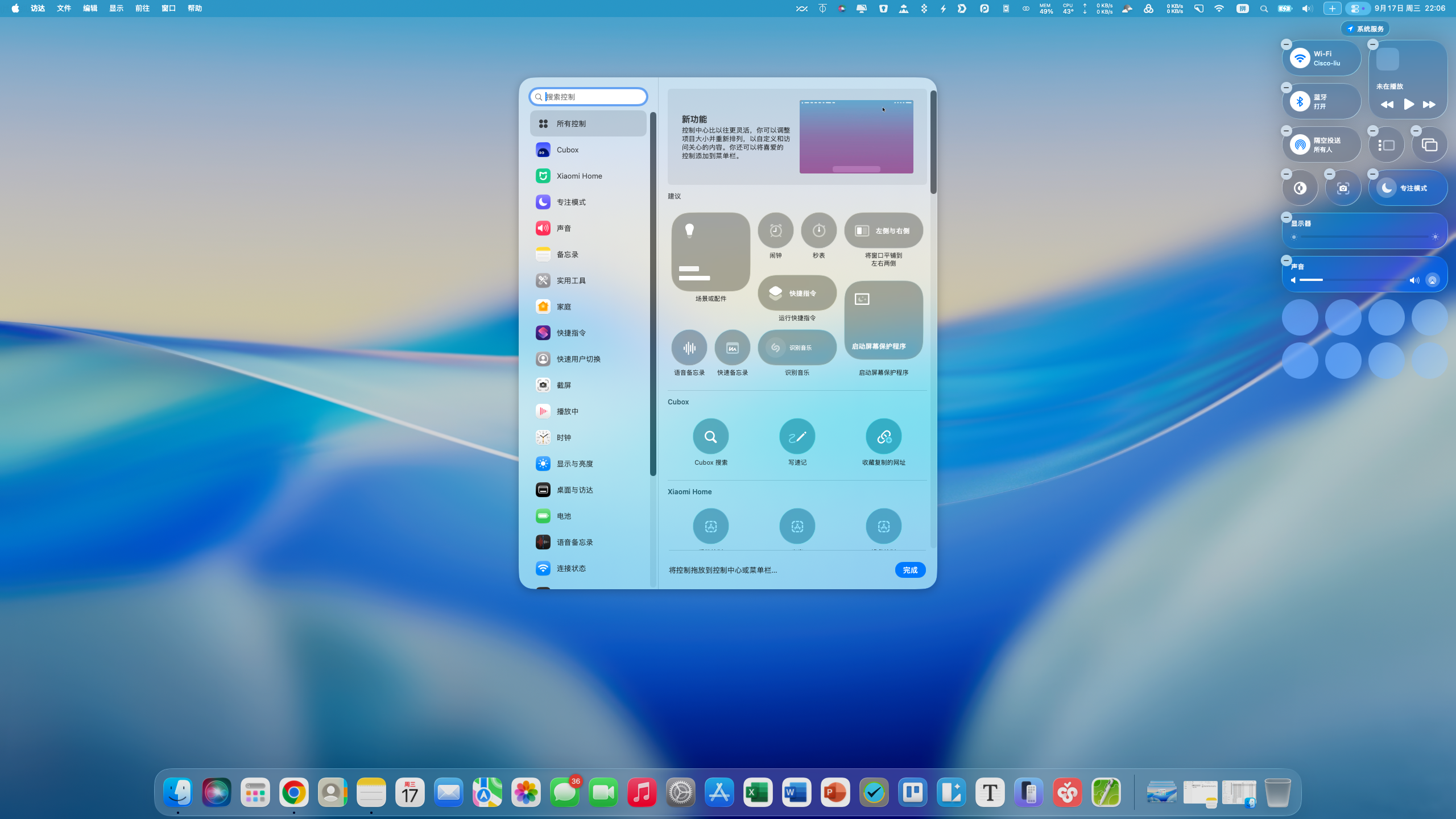 当我们点击右上角的控制中心、网络或音量图标时,弹出的控制面板同样呈现出这种视觉风格,仿佛一块块晶莹剔透的「玻璃」贴合在屏幕之上,整体观感更加通透、现代。