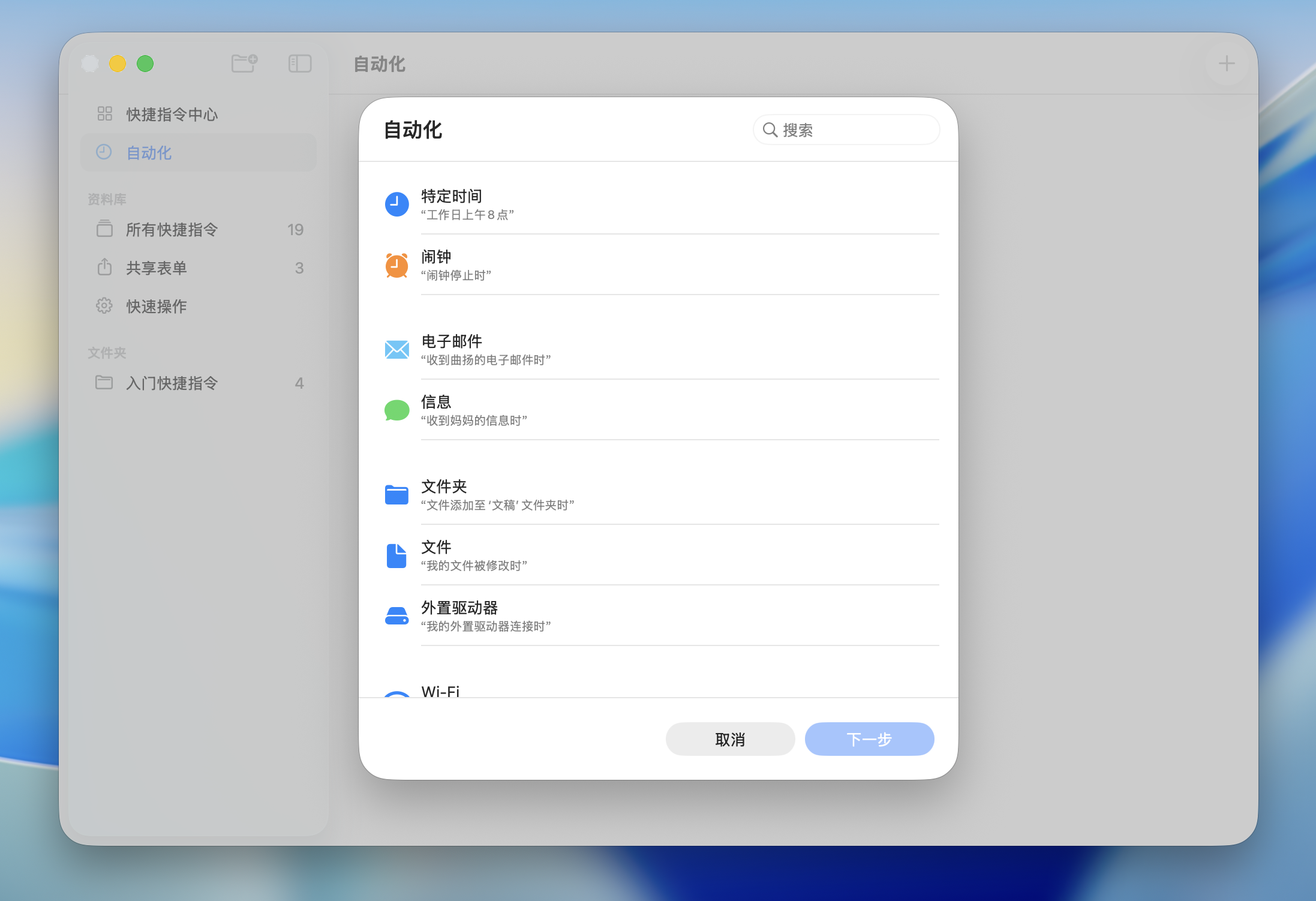 捷径在 macOS Tahoe 上也引入了自动化,可以根据用户提前预设好的条件自动执行流程。此外,macOS Tahoe 的捷径自动化还引入了基于文件、文件夹、电池百分比和外接显示器有关的触发条件,更能发挥 macOS 这个桌面系统的优势。