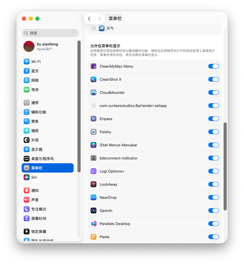 长期以来,过多的菜单栏项目一直是 macOS 的「顽疾」,用户常常需要依赖第三方工具来管理菜单栏图标。而在 macOS Tahoe 中,用户终于可以自行控制哪些应用图标显示在菜单栏上。只需进入「系统设置」-「菜单栏」-「允许在菜单栏显示」,将不需要的项目开关关闭即可。当然如果你需要更加进阶的菜单栏管理的话,可能还是需要第三方工具。
