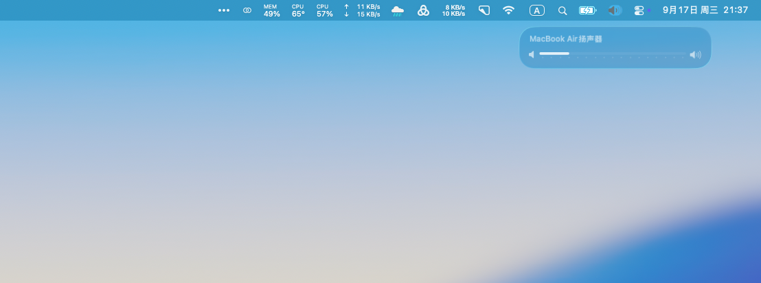 最后,macOS Tahoe 在音量与屏幕亮度调节上也迎来改动。原本居中的 HUD 弹窗被全新的系统控件取代,调节反馈改为横向进度条,显示在屏幕右上角,视觉效果更简洁,也更契合整体 UI 风格。