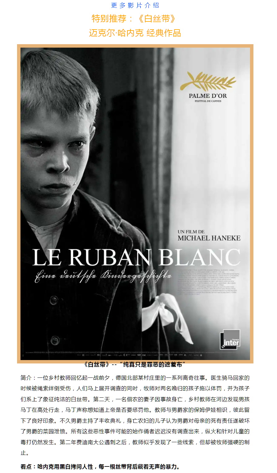 本次“奥地利电影展”由中影集团和奥地利驻华大使馆联合主办,展映影片涵盖了近十多年以来,奥地利影坛涌现的名导佳作,包括迈克尔·哈内克拿下戛纳电影节金棕榈大奖的《白丝带》、呈现诗人英格褒·巴赫曼如何走出情伤的《巴赫曼的沙漠之旅》、传奇滑雪运动员弗朗茨・克拉默的传记片《雪上飞鹰》、根据罗伯特·塞瑟勒畅销小说改编的《人生一世》、以18岁的盲人女钢琴家玛利亚•特蕾莎•帕拉迪丝为主人公的《音乐之光》、女性拳击片《吉普赛女王》等。