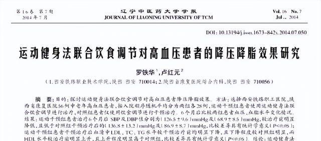 [1]罗铁华.运动健身法联合饮食调节对高血压患者的降压降脂效果研究,辽宁中医药大学学报,2014-07-01