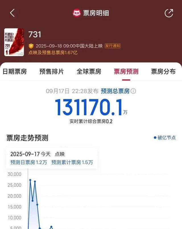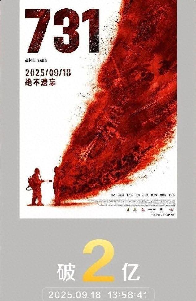 今天看到《731》电影上映了,心里有点不是滋味,听说讲的是日军在哈尔滨搞细菌实验的事,首日就破了十个内地影史纪录,排片超过二十五万场,真够多的,我查了下,票房已经到两亿了,估计能冲到十三亿,比不少