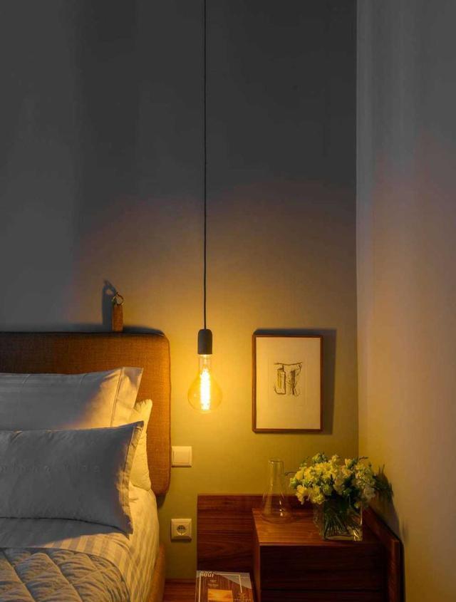 房间也主要是带给人温暖感的配色和材质为主——木质的简约床头柜格和暖黄色调的布艺床头软包,为睡眠增加柔和和温暖的感觉。