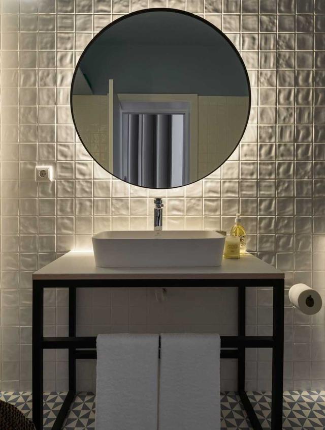 卫生间用了和厨房类似的马赛克小花地砖,搭配纯白的小方墙砖,简约中又透着设计感。镜子和水槽管都用了壁挂的设计,减少卫生死角的同时整体看起来更轻盈。
