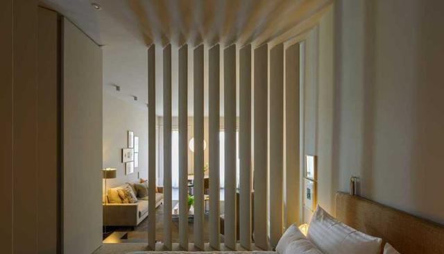 一面墙设计隐形衣柜,保证储物的同时隔开了玄关和卧室。另一面围上栅栏,做了半封闭式隔断,区分客厅和卧室。