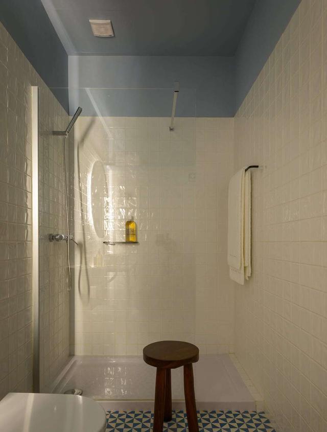一大面玻璃隔断了干湿区,没有门看起来更简洁。同时抬高湿区地面,防止积水问题。