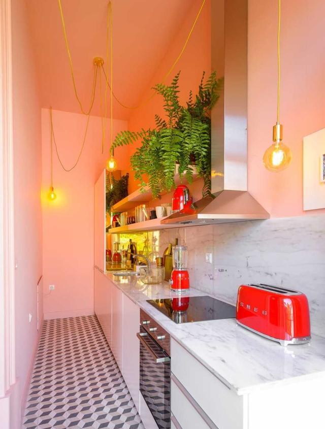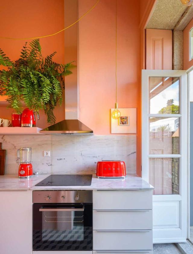 厨房区域刷上了亮眼的暖橙色,模拟太阳光照的颜色。和方格小花砖还有绿植搭起来热情洋溢,度假感十足。一字型台面贴合原本厨房狭长的布局,灶台、烤箱、油烟机、面包机一应俱全,底柜加隔板也可以满足储物需求。