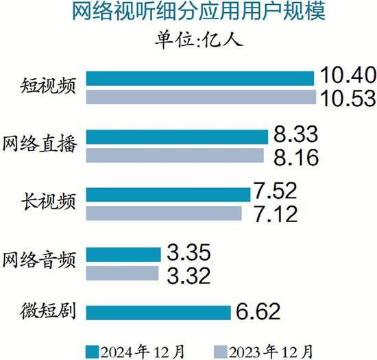 截至2024年12月,我国短视频用户规模达到10.40亿,使用率达93.8%,连续6年保持网络视听应用细分领域第一。微短剧用户规模迅速增长,应用使用时长追平即时通讯。
