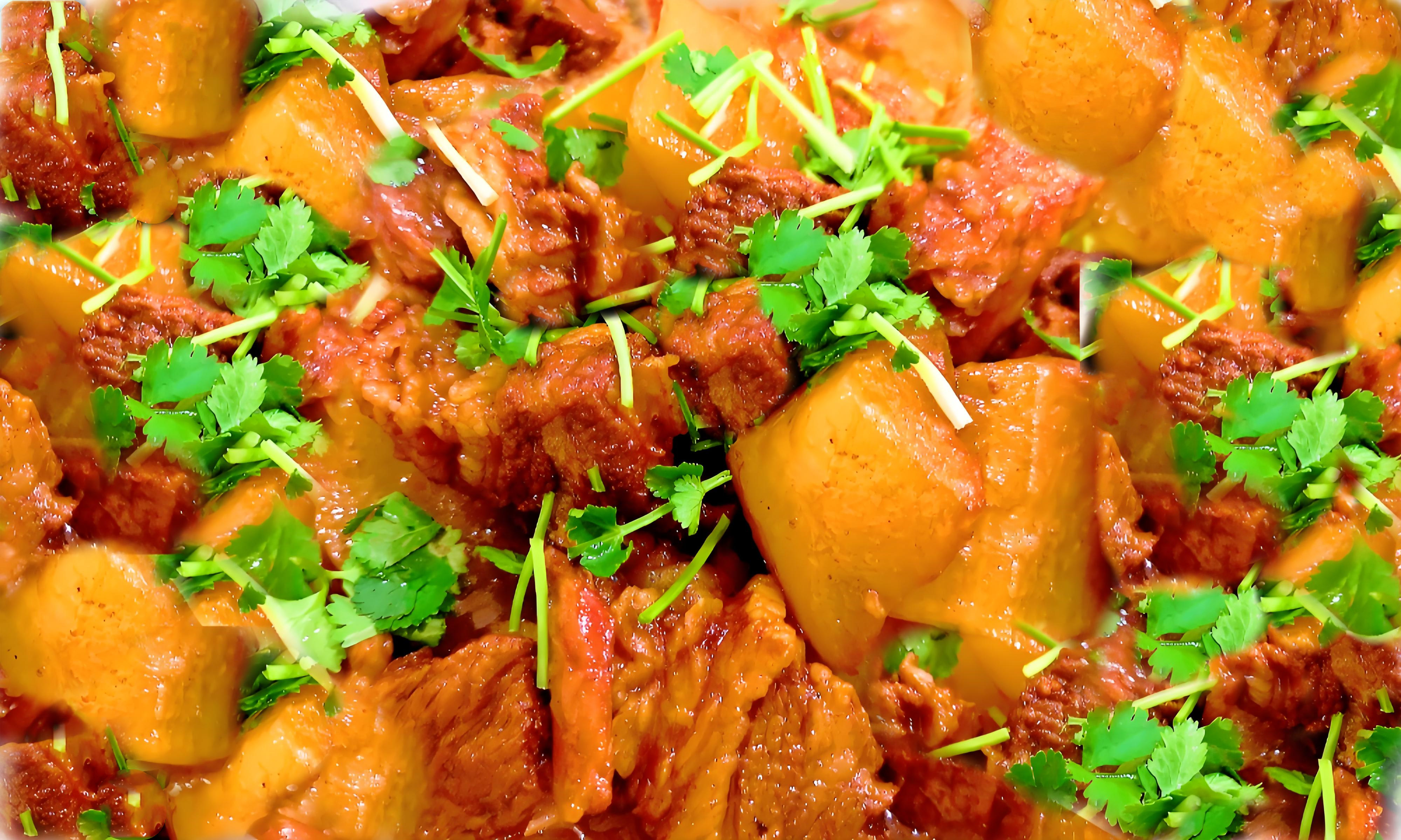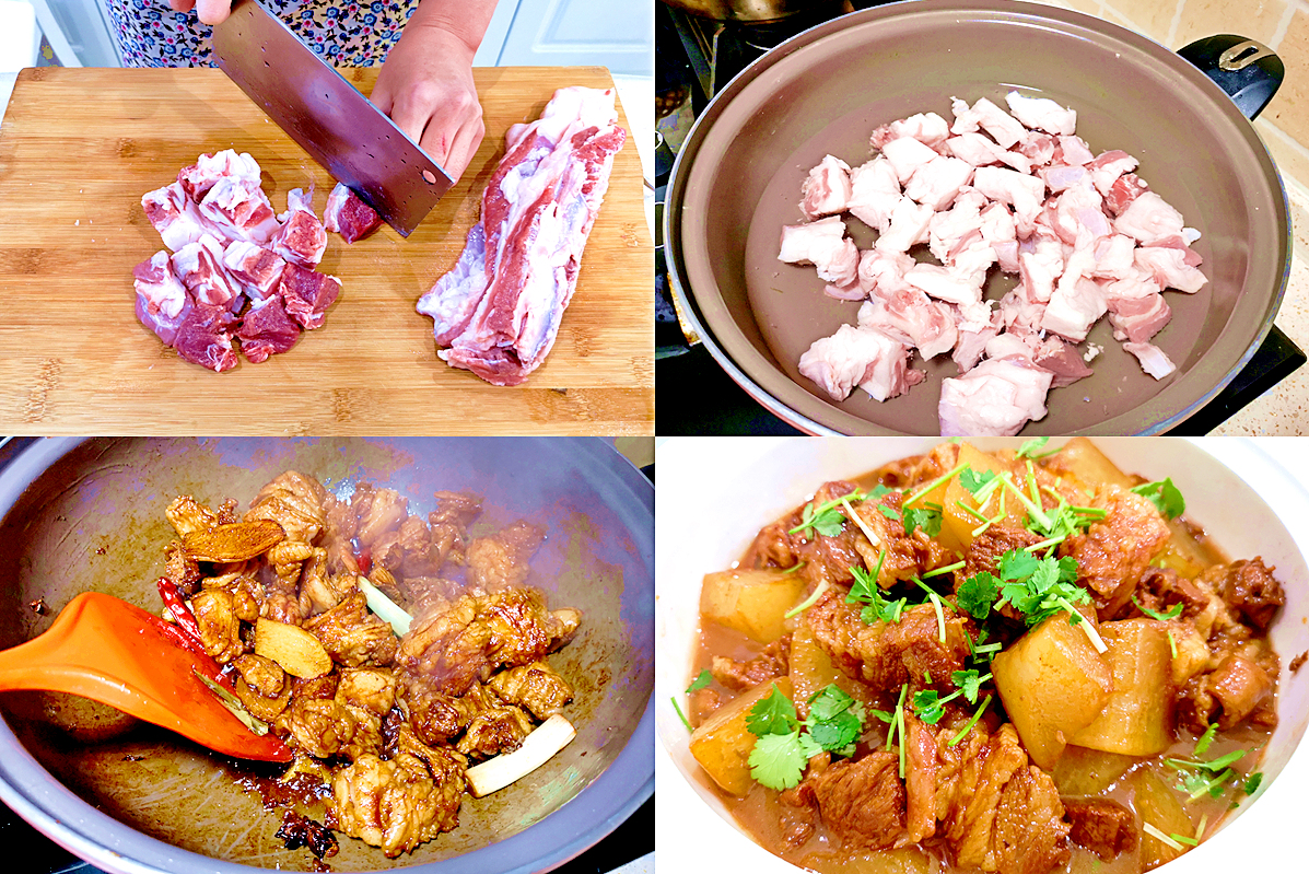 4. 白萝卜去皮切块,放入锅中继续炖20分钟。最后大火收汁,撒点葱花和香菜就完成啦!