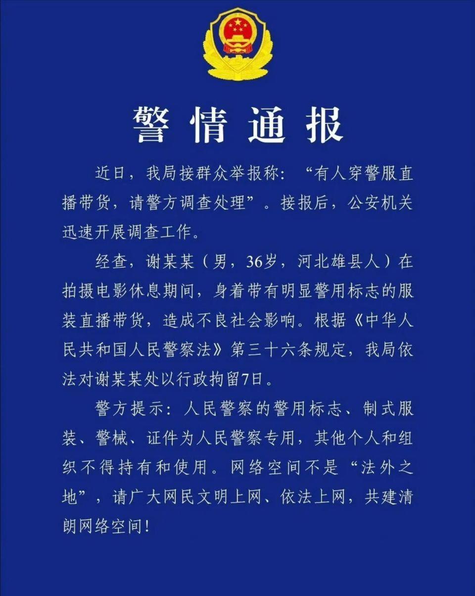 9 月 17 日晚,云南警方发布最终调查结果,通报中明确指出:谢孟伟所穿服装带有标准警用标志,其直播带货行为已违反《人民警察法》第三十六条 “不得非法制造、贩卖、持有、使用人民警察制式服装、警械、证件” 的规定,决定对其依法行政拘留七日。