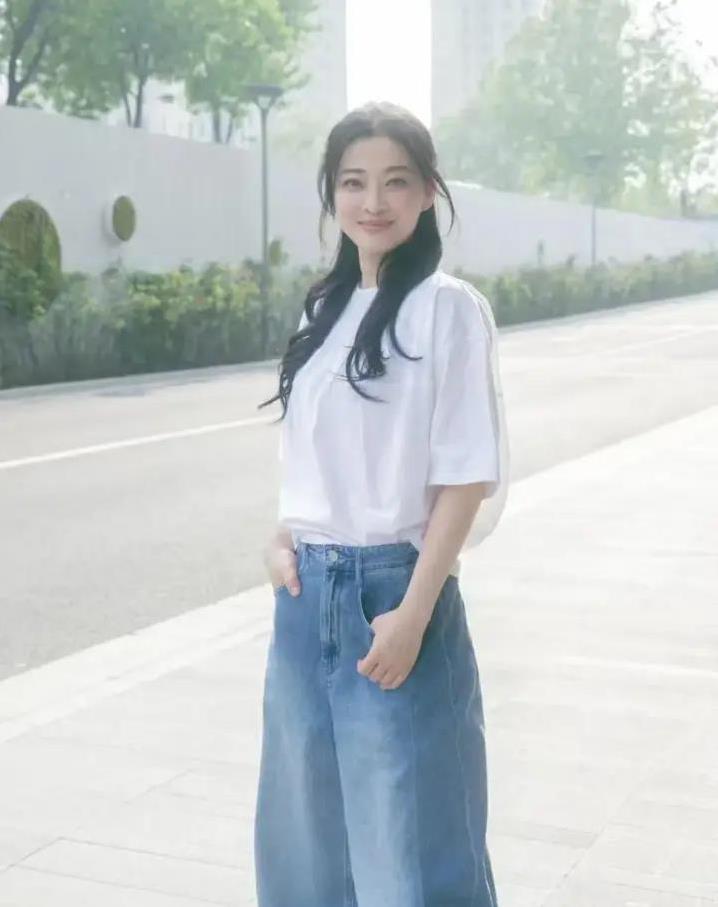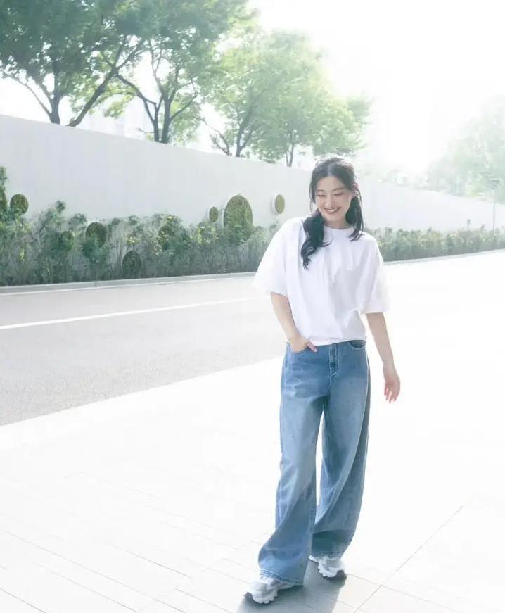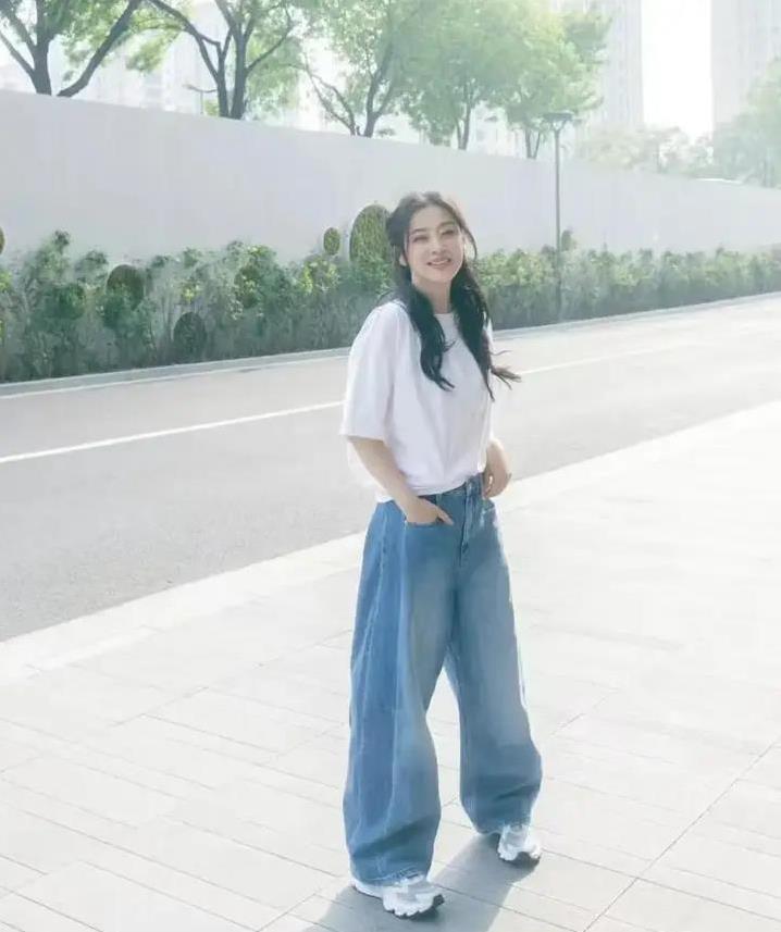 牛仔裤也是梅婷的“秘密武器”。她选了条阔腿牛仔裤,版型宽松,遮肉又显腿长。脚上再踩一双银灰色运动鞋,舒服又时髦。整套衣服简单到不行,但就是好看,姐妹们完全可以照着穿。